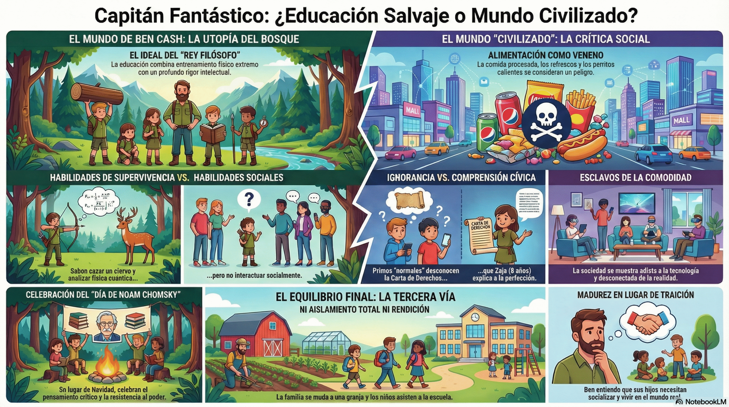 Ben Cash y su mujer han criado a sus seis hijos en lo profundo de los bosques del estado de Washington. Aislados de la sociedad, los niños reciben una educación física e intelectual rigurosa: saben cazar, escalar montañas y debatir sobre física cuántica y filosofía.